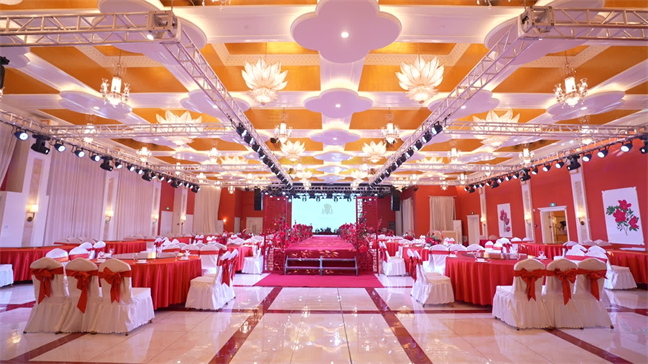 鉑金大廳—色彩濃烈,現代式裝修,面積560㎡,層高6米,開合大屏配合舞美燈光,唯美震撼,可承接30桌的中型宴會;12米長的可移動T臺收起后,就變成了可容納400人同時落座的大型多功能會議室。